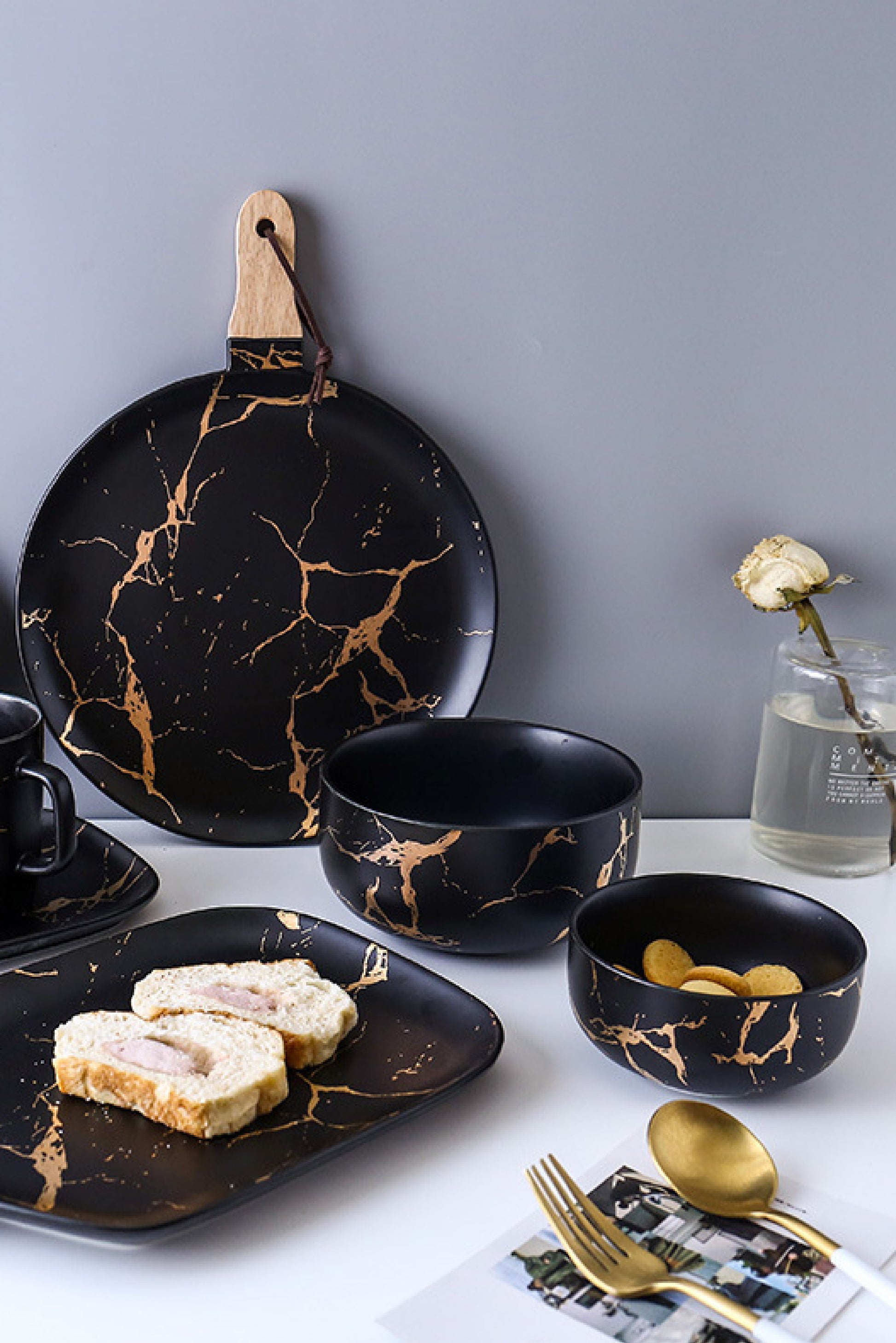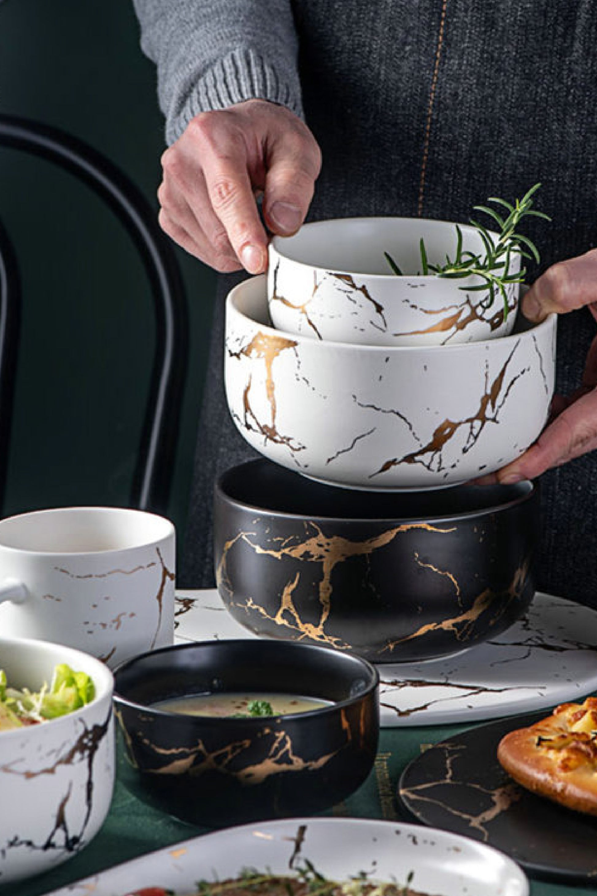 El Bowl Marble & Gold es una pieza de porcelana mate en tonos blanco y negro, realzada con delicados detalles dorados que aportan un aire sofisticado y moderno.