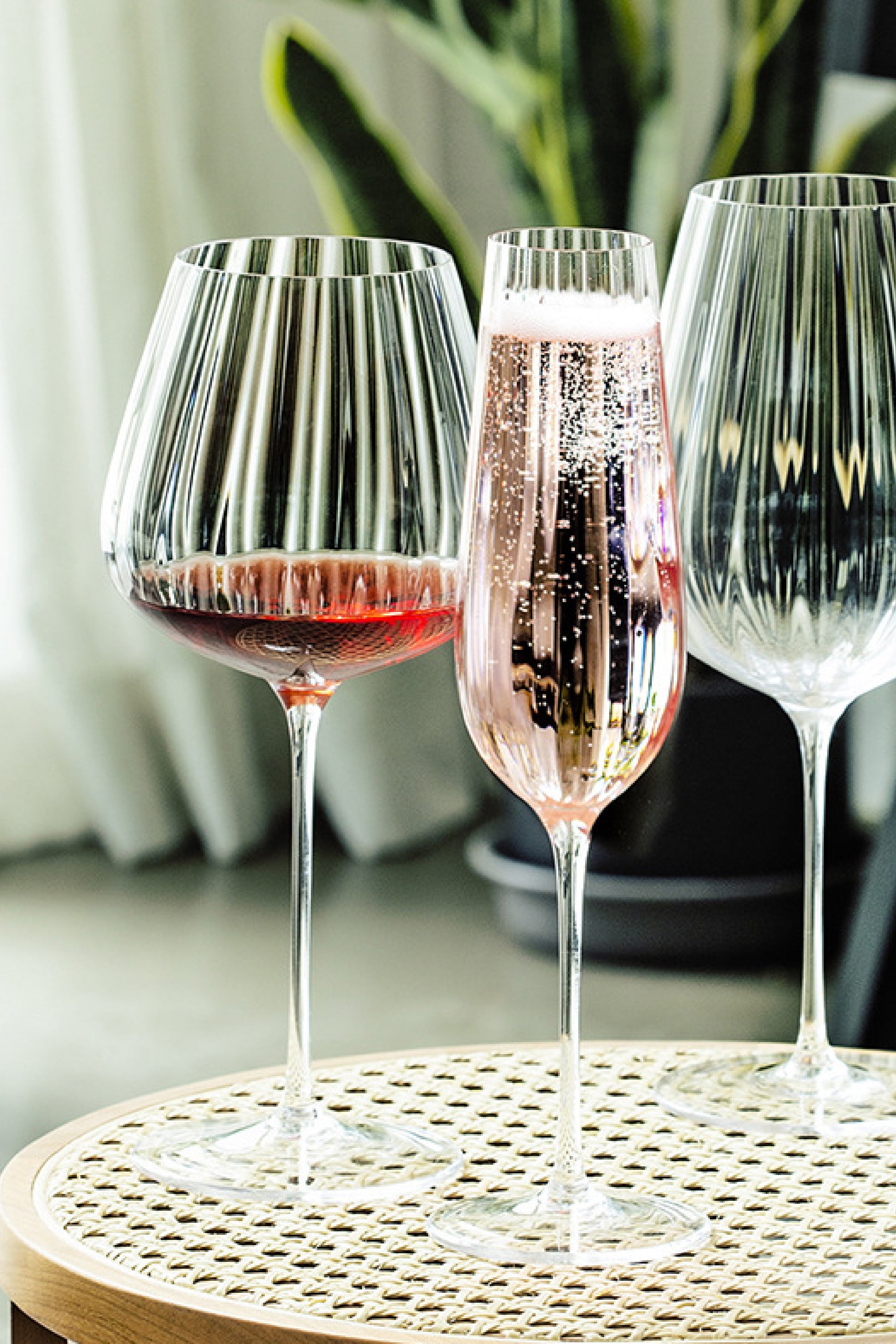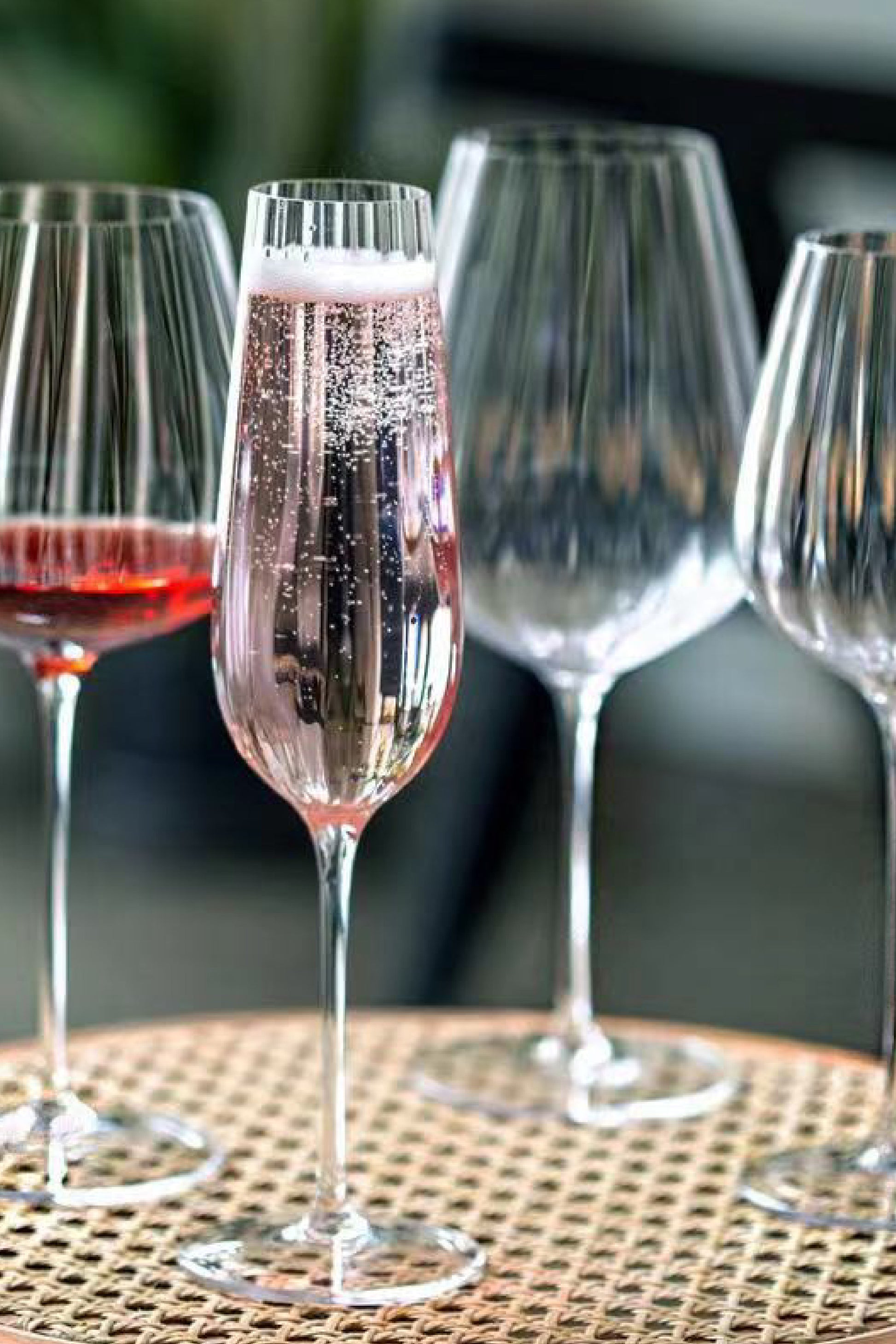 La copa alta Bel transforma cada brindis en un momento especial. Su diseño estilizado con relieve vertical en el cristal crea un juego de destellos que resalta la efervescencia y brillo del vino espumante.