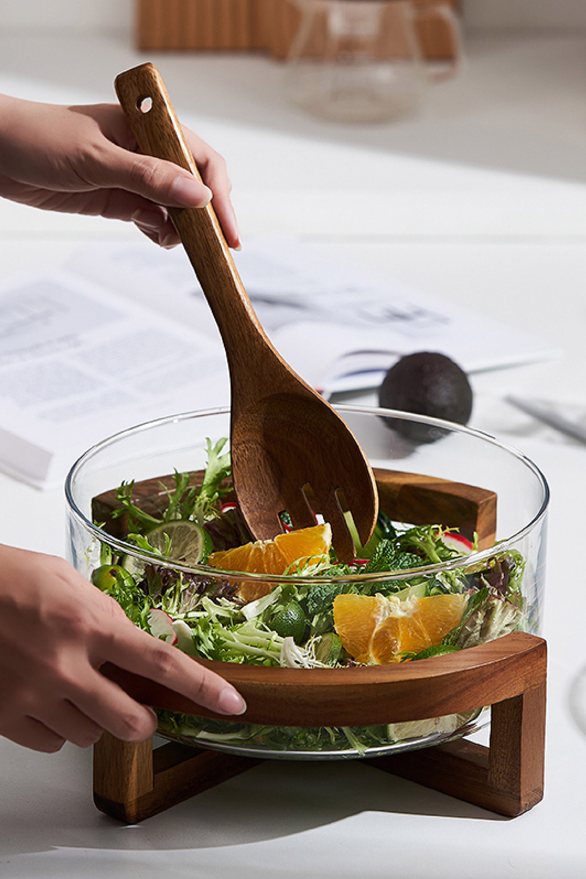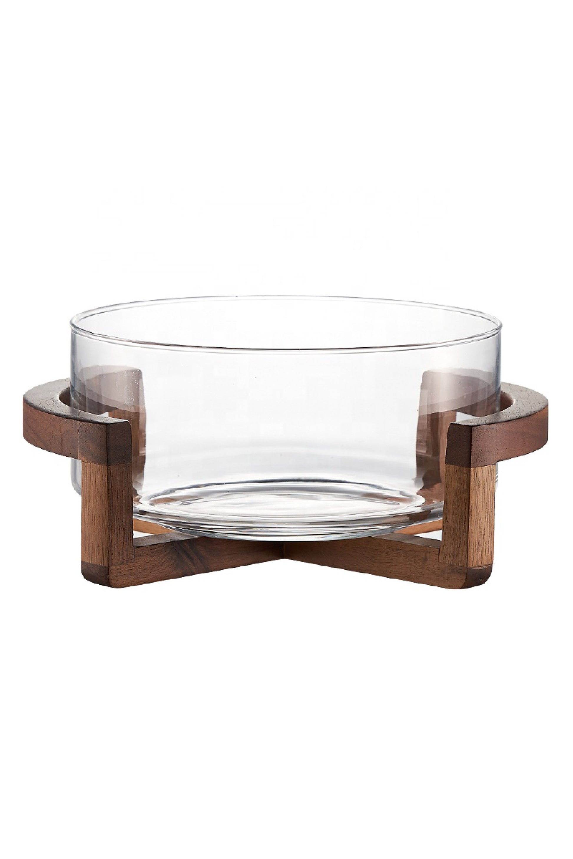 Ensaladera de vidrio con base de madera de acacia