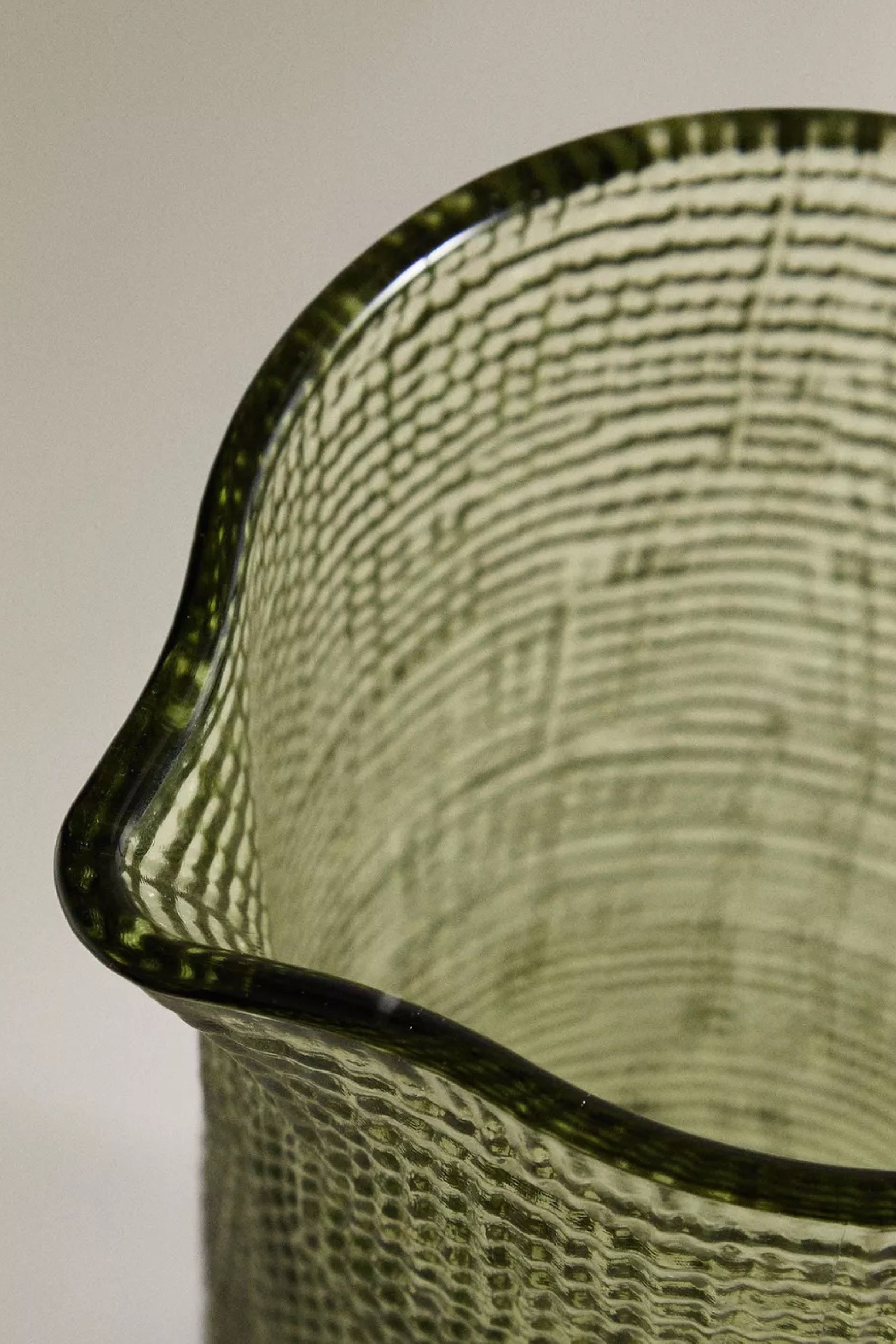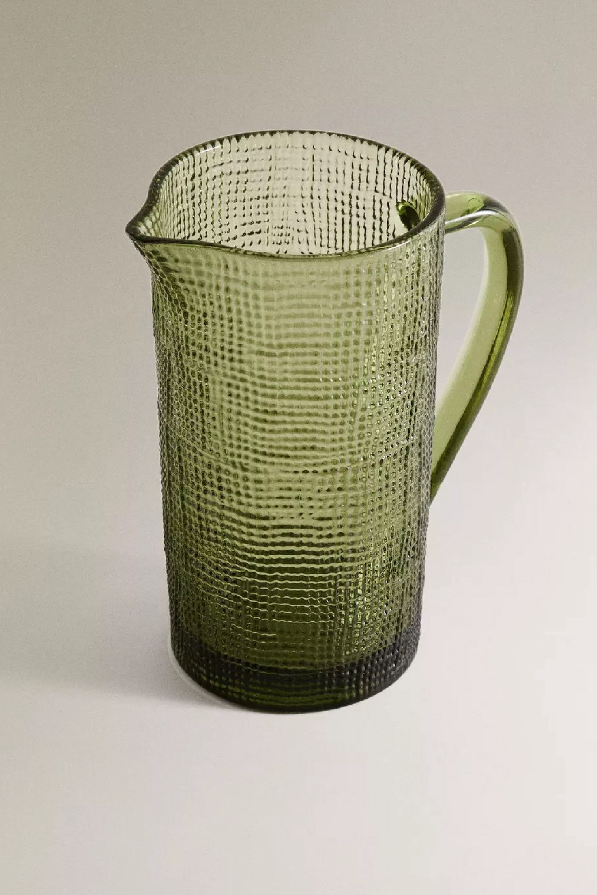 La Jarra Amélie es la pieza que completa con encanto esta línea de cristalería vintage. Su cristal verde con textura de cuadros añade un aire nostálgico y sofisticado, ideal para servir con estilo desde agua hasta limonadas, jugos o cócteles.