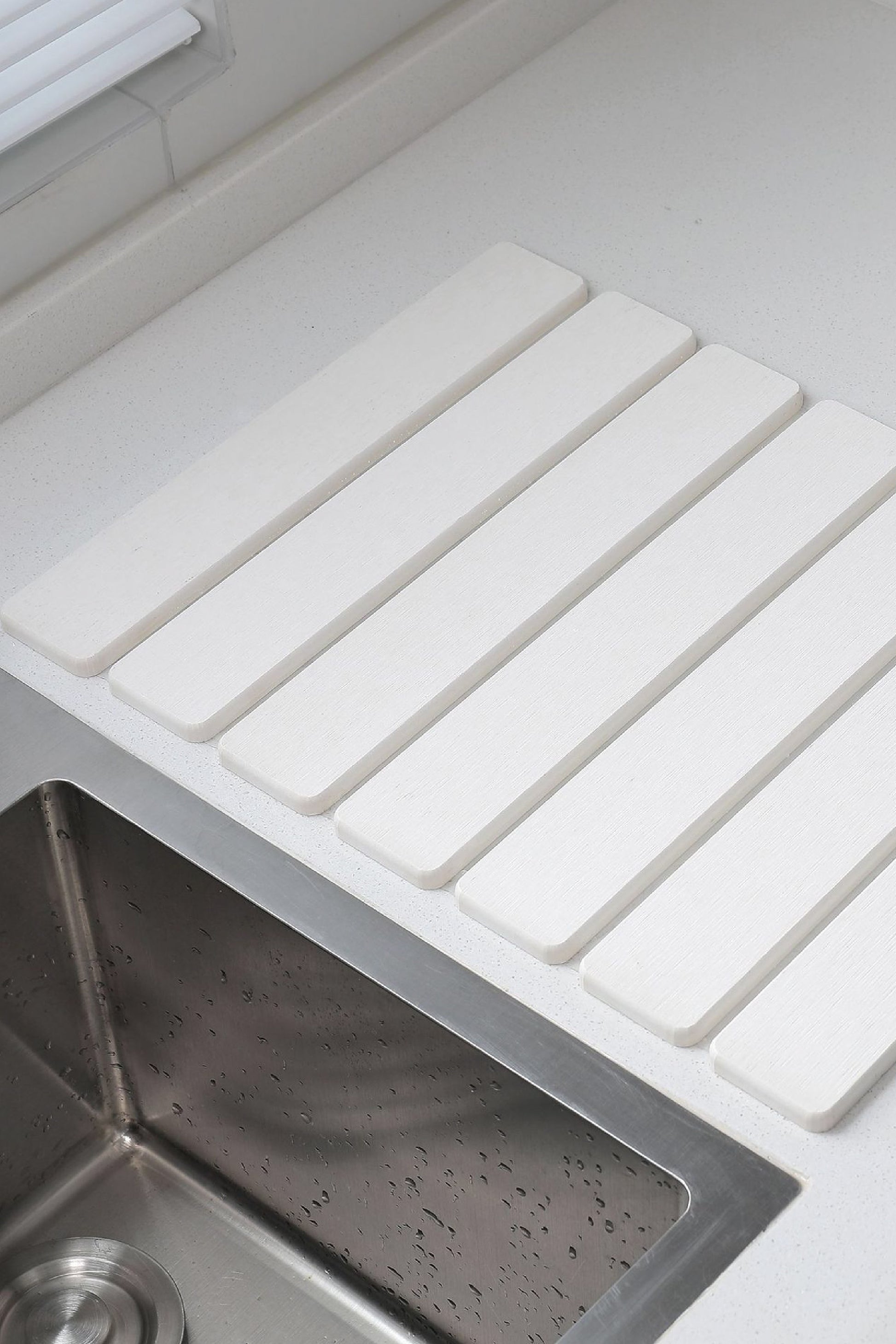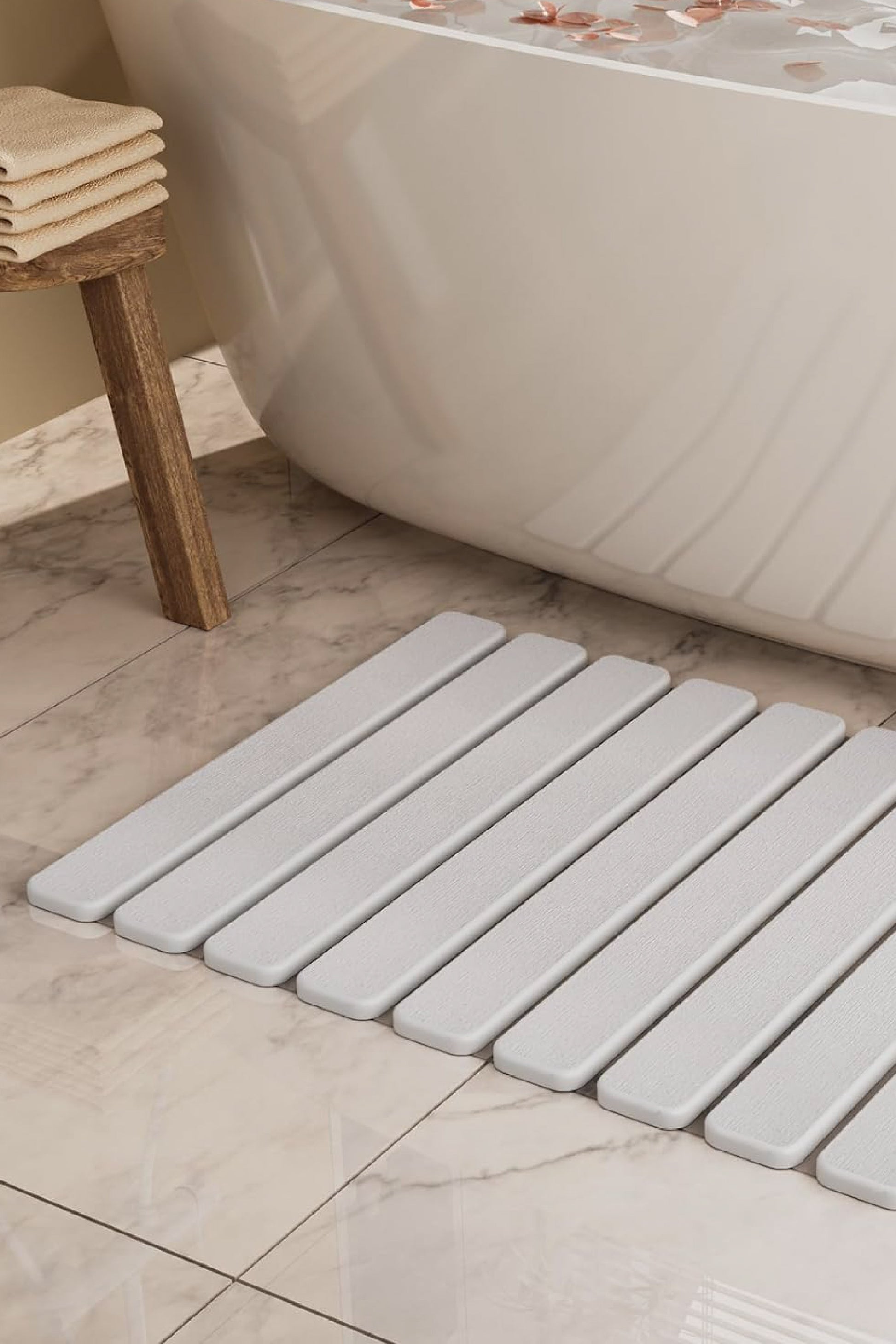 El Mat Pietra está elaborado en piedra diatomita, un material natural conocido por su gran capacidad de absorción y secado rápido. Es ideal para la salida de la ducha o para colocar junto al lavabo, manteniendo siempre el espacio limpio, seco y libre de humedad.
